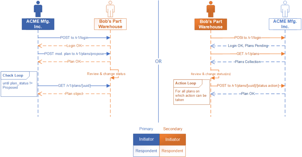 When an initiator connects to a respondent who has new plans to propose, it is the respondent’s job to notify the initiator using the login message that there are new pending plans to review. This is necessary because either side can modify the agreement, but in a REST API only one side can initiate communication.