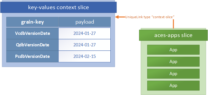 In the context slice pattern, we define a Level 2 slice with slice-type “key-values”, a format that assumes all grain keys are the name of a field, attribute, or property, and the payload of the grains inside the slice contains the values associated with that key*. Then, any slice can indicate that it inherits that context with a unique link pointing to the context slice’s UUID (link type “context-slice”).